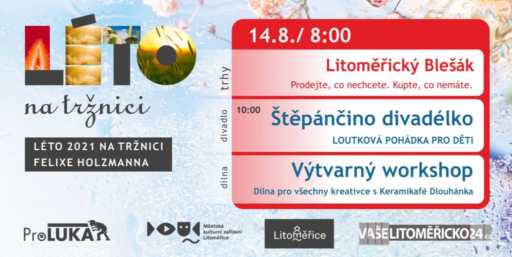 Litoměřice – Užijte si tuto sobotu 14. srpna parádní dopoledne na Tržnici Felixe Holzmanna v Litoměřicích. Od 8 do 12 hodin se tady bude konat další „Blešák,“ na kterém můžete koupit doslova „všechno, na co si vzpomenete.“ V 10 hodin bude na tržnici hrát Štěpánčino divadélko pohádku pro děti a celé dopoledne bude také probíhat výtvarný workshop s Keramikafé Dlouhánka.