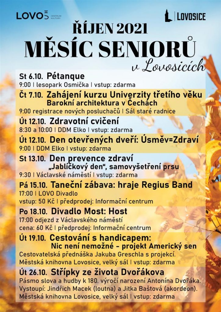 V pondělí 18. října je organizovaný zájezd do Divadla v Mostě na představení s názvem „Host.“ Autobus odjíždí z Václavského náměstí v 17 hodin. O den později, v úterý 19. října, přijďte do lovosické knihovny na přednášku Jakuba Greschla „Cestování s hendikepem: Nic není nemožné – projekt Americký sen.“ Součástí přednášky je projekce, vstupné zdarma.