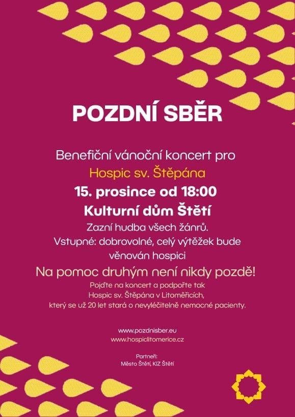 Štětí – Přijďte se naladit na blížící se vánoční svátky a udělejte dobrý skutek! Ve středu 15. prosince se bude v Kulturním domě ve Štětí konat koncert kapely Pozdní sběr. Koncert začne v 18 hodin a bude celý benefiční – veškerý výtěžek z dobrovolného vstupného půjde na konto Hospice sv. Štěpána.