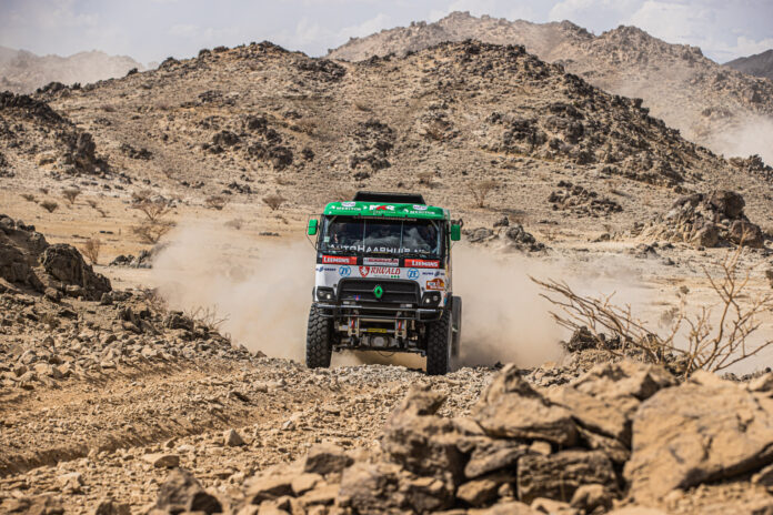 Ha‘il/Chvalín – V elitní desítce zahájila dvojice severočeských kamionů Maria Kresse 44. ročník dakarské rally. Pilot hybridního speciálu Huzink cílem projel šestý, kolega de Baar desátý.