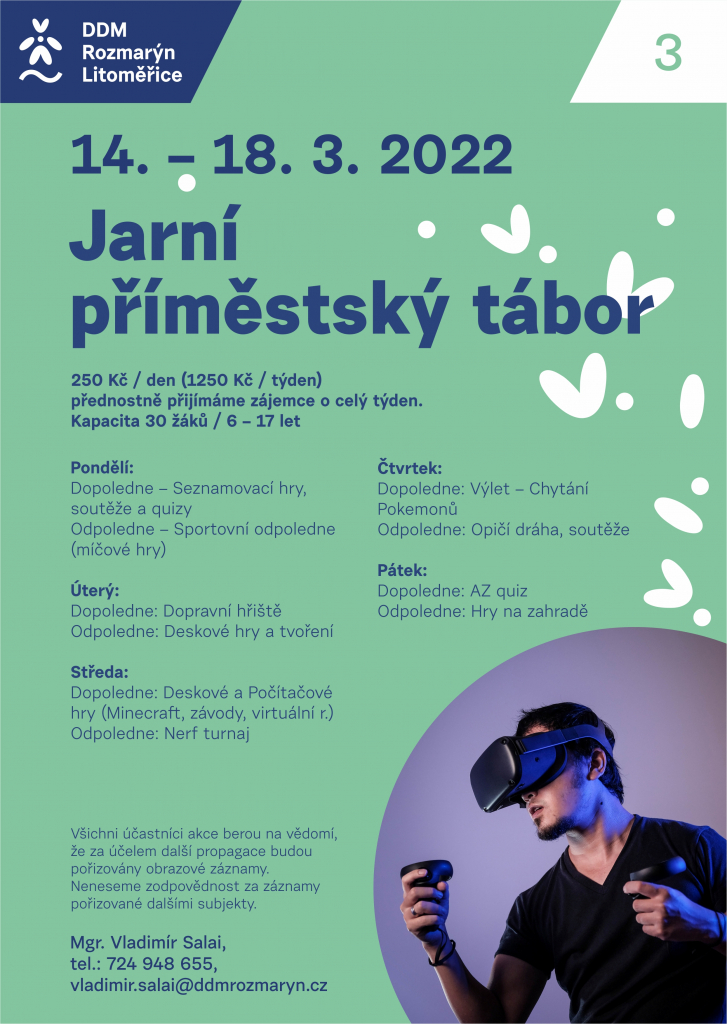 Účastníkům přitom v týdnu od 14. do 18. března nabízí bohatý program na celý den. Děti do Rozmarýnu přicházejí od 6.30 do 8.00 hodin a odcházejí mezi 15. a 16. hodinou. Rozmarýn zajistí také teplý oběd.
