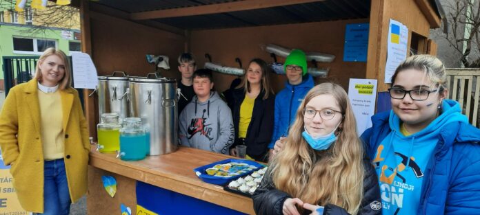 První charitativní akce proběhla před naší školou, kde prodávali žáci 8.A a paní učitelka třídní nealkoholický NÁPOJ MÍRU v barvách ukrajinské vlajky. Modrá a žlutá citronáda všem kolemjdoucím moc chutnala. Úžasné bylo, s jakou energií se děti chopily úkolu. Samy organizovaly, pekly moučníky, koordinovaly služby u stánku a činnost celého projektu.