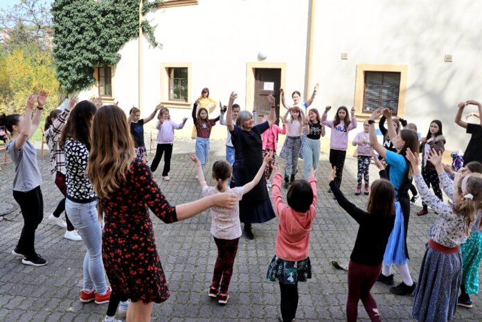Úvod obstaraly izraelské tance, do jejichž tajů zasvětila zájemce Lýdie Martykánová. „Jsou to vlastně lidové tance, které se tančí především o svátcích. Vycházejí z tory a z biblických textů a mají svou určitou choreografii a abecedu kroků, z nichž se pak ten který tanec skládá,“ vysvětlovala ústecká lektorka. Netrvalo dlouho a na nádvoří areálu dokázali mladí i dospělí roztočit typické židovské taneční kolečko.