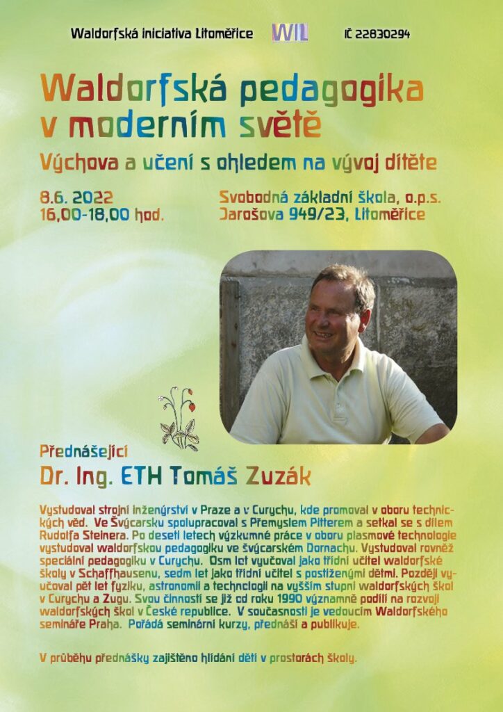 Litoměřice – Tomáš Zuzák, vedoucí Waldorfského semináře Praha, přijal pozvání Svobodné základní školy a ve středu 8. června přijede do Litoměřic. Přijďte si do budovy školy v Jarošově ulici vyslechnout zajímavou přednášku s názvem „Waldorfská pedagogika v moderním světě.“ Povídání bude mít zhruba dvě hodiny.