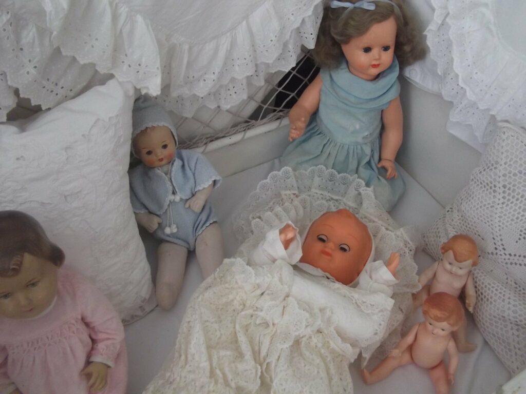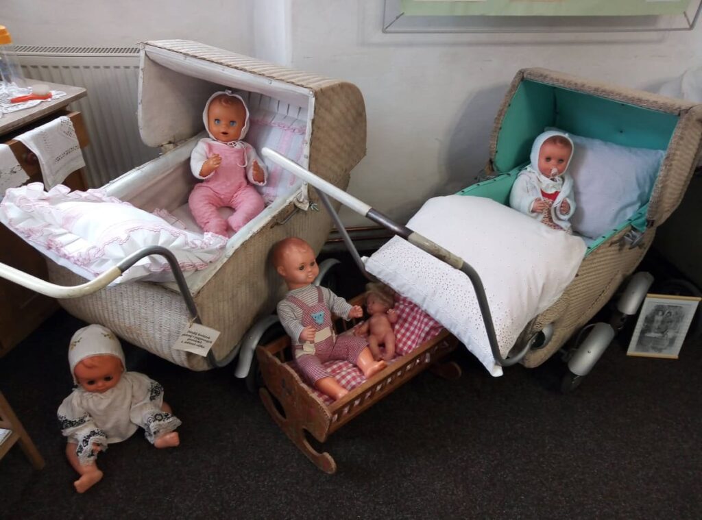 Výstava zahrnuje dětské i loutkové kočárky, panenky, oblečky, medvídky, pokojíčky, peřinky a dobové fotografie.