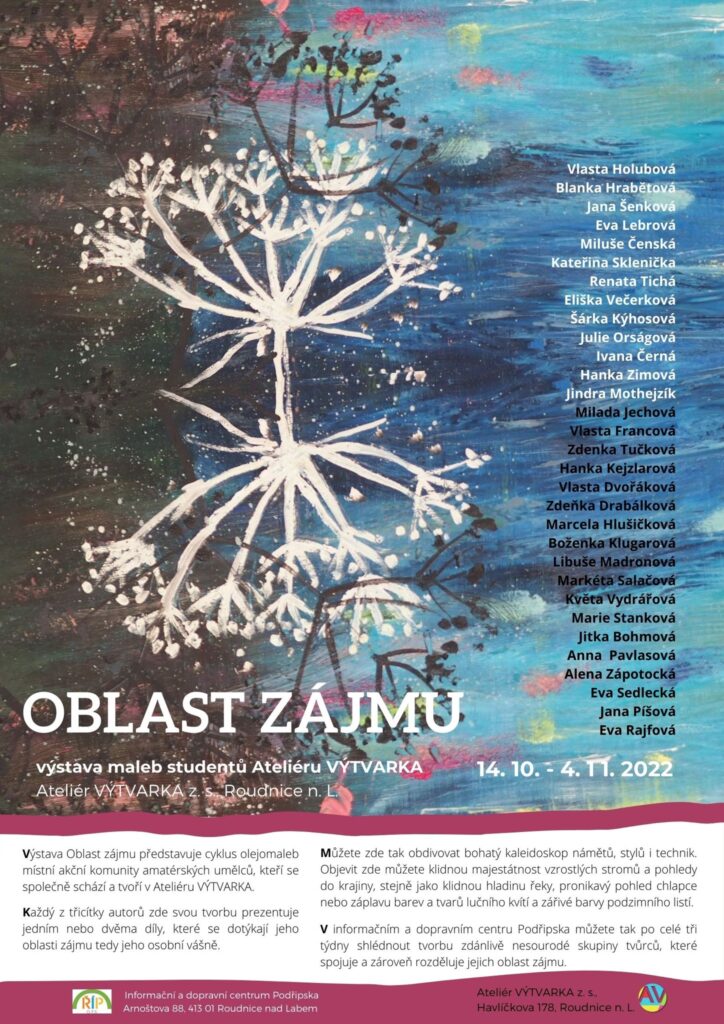 Roudnice nad Labem – Oblast zájmu. Tak se jmenuje výstava, která bude dnes – tedy v pátek 14. října v 16 hodin – slavnostně zahájena v roudnickém Informačním a dopravním centru Podřipska. Své obrazy tentokrát vystavují amatérští umělci, kteří navštěvují kurzy v Ateliéru VÝTVARKA a tvoří pod vedením Jitky Kratochvílové.