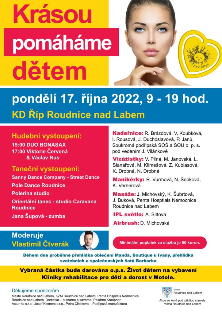 Roudnice nad Labem – Víte, že v pondělí 17. října proběhne v Kulturním domě Říp v Roudnici nad Labem v pořadí už sedmý ročník charitativní akce „Krásou pomáháme dětem?“ Přímo v Kulturním domě se od 9 do 19 hodin můžete nechat zkrášlit a svým dobrovolným příspěvkem pomoci dobré věci. Přítomné budou vizážistky, kadeřnice, ale i maséři a manikérky.
