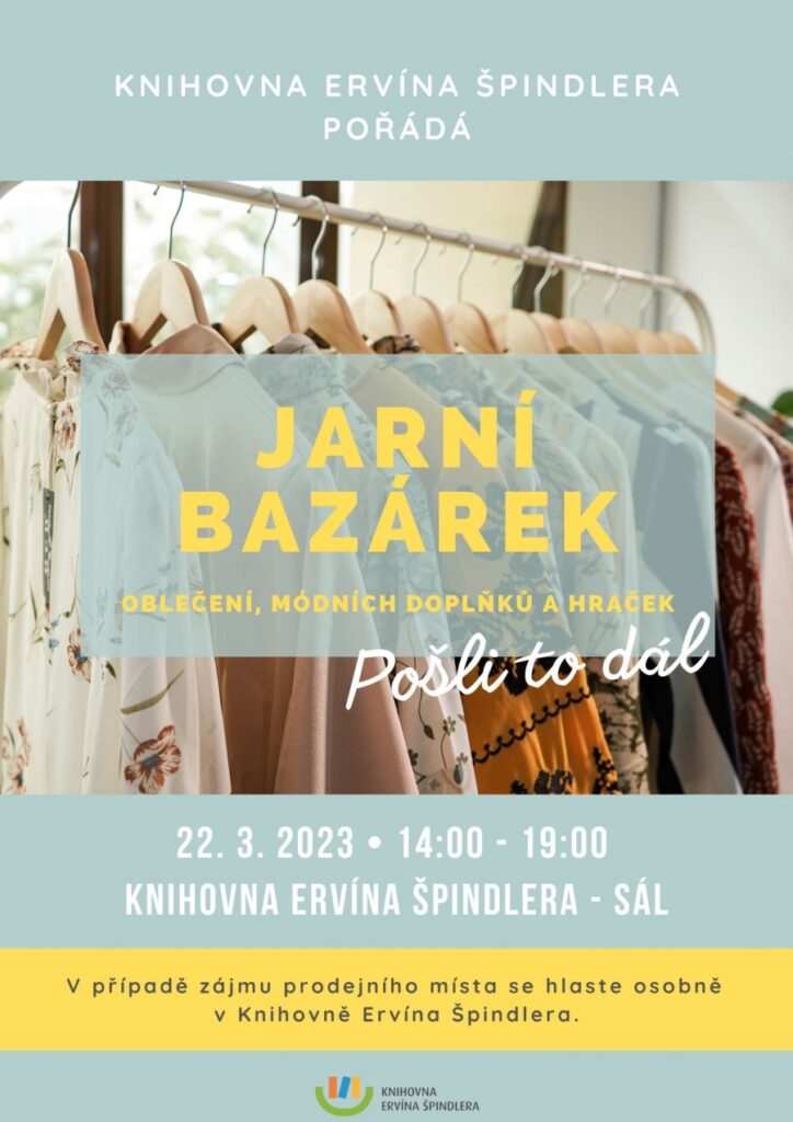Od 14 do 19 hodin bude v Knihovně Ervína Špindlera probíhat Jarní bazárek. Nabídne oblečení, módní doplňky a hračky. Rozhodně přijďte, bude z čeho vybírat! Akce proběhne v sále knihovny.
