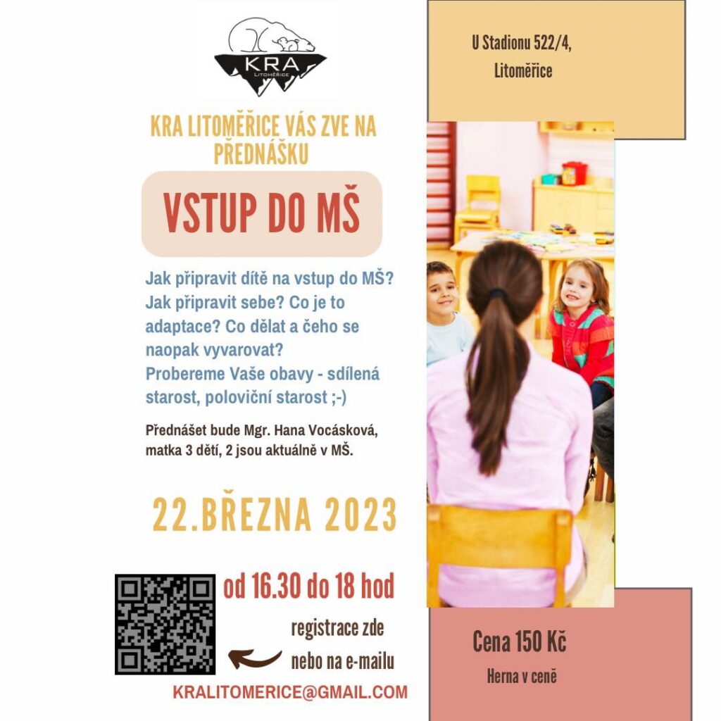 Přednášet bude Mgr. Hana Vocásková, matka tří dětí. Dvě z nich jsou aktuálně v mateřské škole. Povídání začíná v 16.30, vstupné 150,- Kč (herna v ceně).