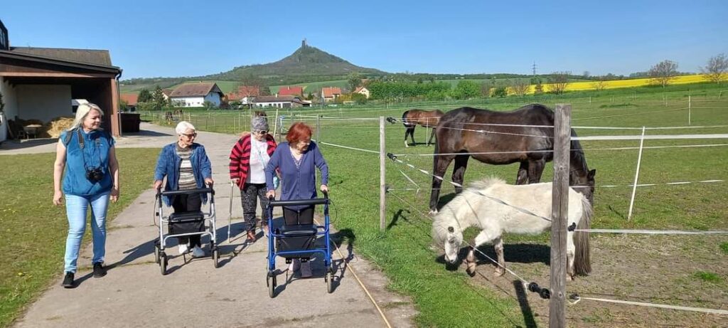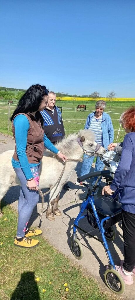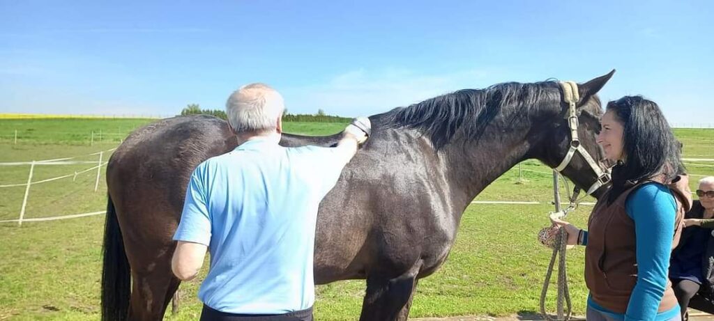 Senioři z Domova na Dómském pahorku  krmili a hřebelcovali koně