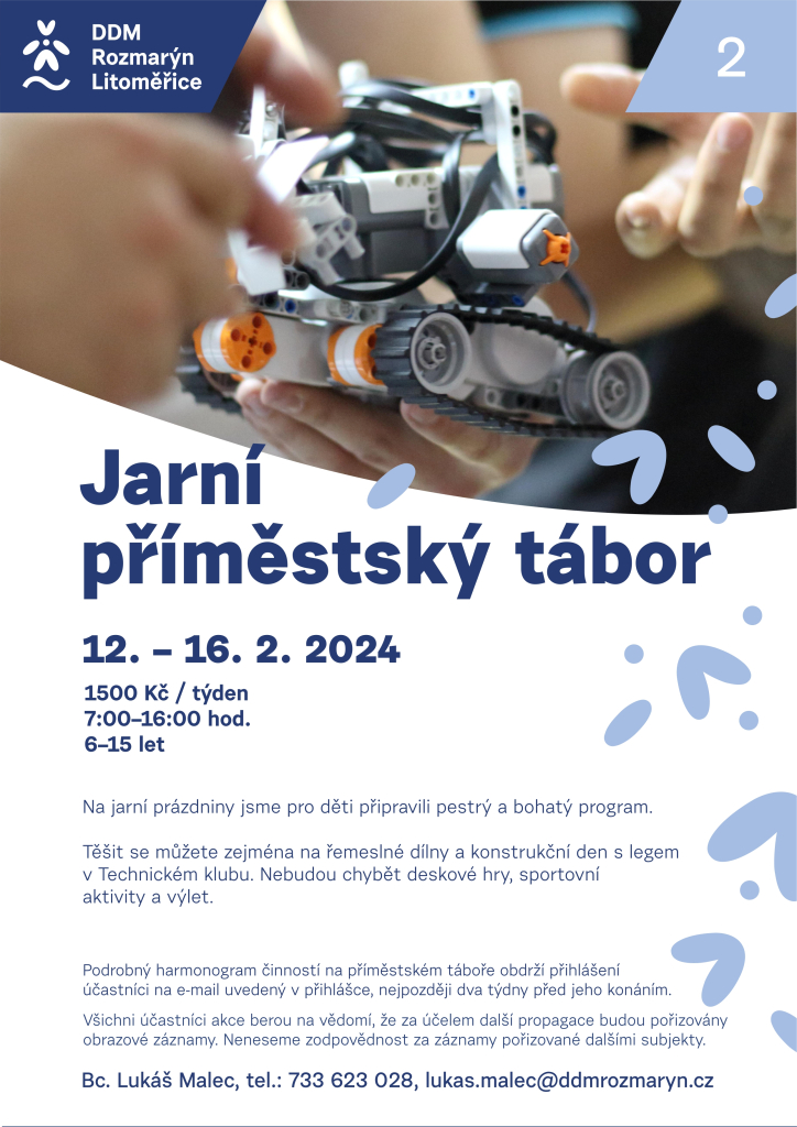 Jarní příměstský tábor je určen pro školáky od šesti do patnácti let, kterým Rozmarýn ve všední dny zajistí program od sedmi až do šestnácti hodin. Nebudou chybět deskové hry, aktivity v Technickém klubu mládeže, sportovní aktivity a výlet.