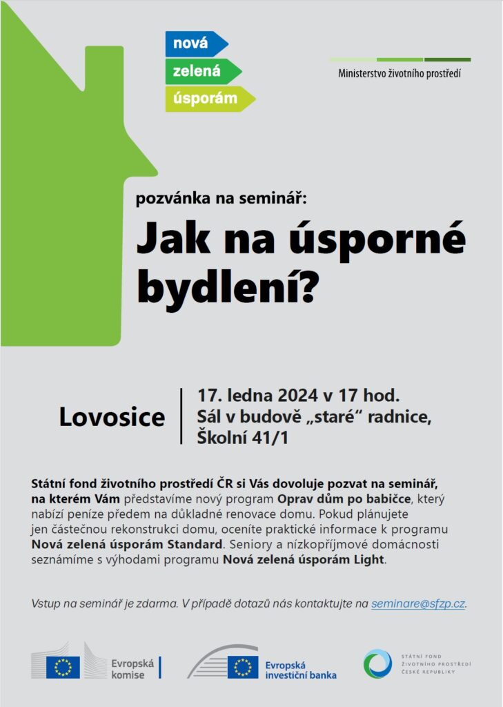 Lovosice – Ve středu 17. ledna jste srdečně zváni do sálu staré radnice v Lovosicích. Od 17 hodin tam na Vás budou čekat pracovníci Státního fondu životního prostředí, aby Vám představili dotační programy, které aktuálně můžete čerpat v rámci projektu „Nová zelená úsporám.“ Vstup na seminář je ZDARMA.