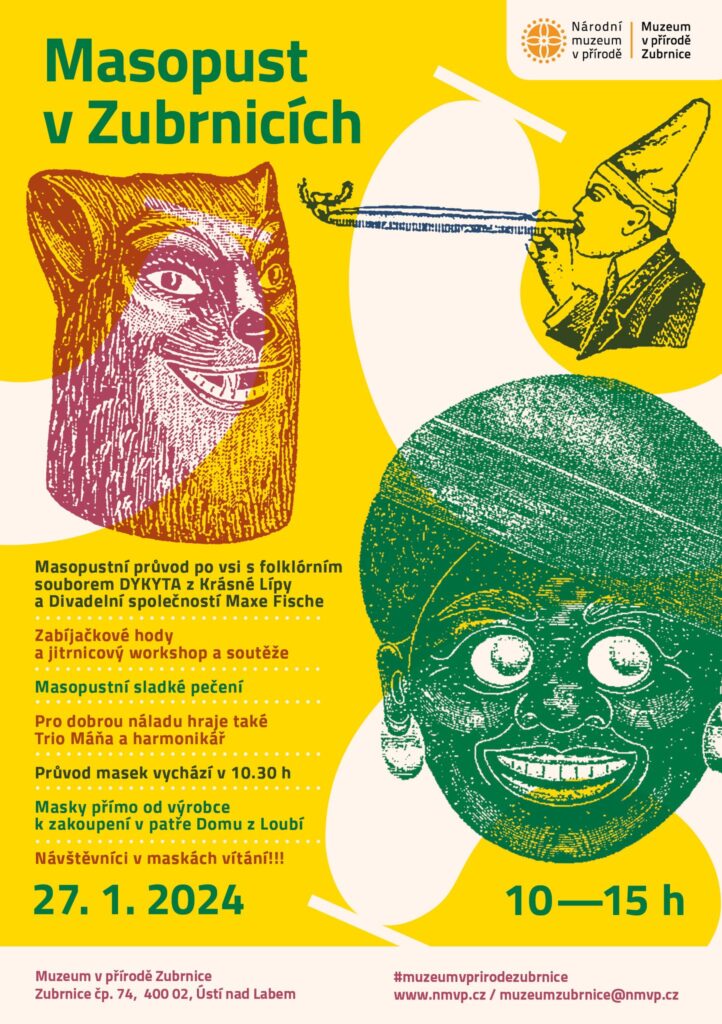 Zubrnice – Muzeum v přírodě Zubrnice Vás tuto sobotu 27. ledna zve na tradiční oslavu MASOPUSTU. Akce bude probíhat od 10 do 15 hodin a zabaví všechny návštěvníky bez rozdílu věku. Těšit se můžete zabíjačkové hody, sladké masopustní pečení, jitrnicový workshop a spoustu dalšího!