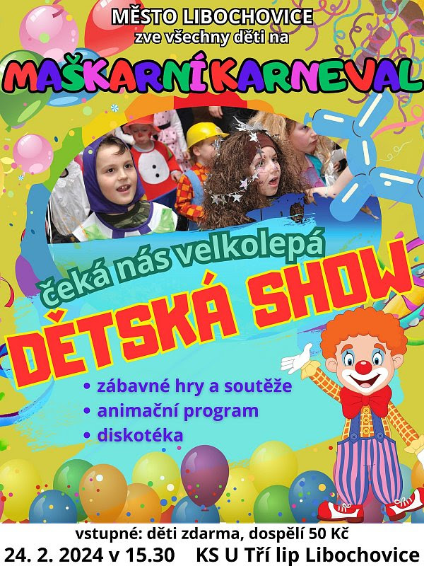 Libochovice – Kulturní středisko U Tří lip v Libochovicích bude v sobotu 24. února plné masek a převleků. Město Libochovice totiž pořádá MAŠKARNÍ KARNEVAL PRO DĚTI. Zábavná show plná soutěží a her začíná v 15.30 hodin. Převleky s sebou!
