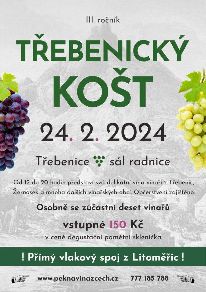 Třebenice – V sále Městského úřadu Třebenice se tuto sobotu 24. února koná v pořadí už třetí ročník Třebenického koštu. Akce pro všechny milovníky toho nejlepšího místního vína začíná v pravé poledne a potrvá až do večera. Letos se osobně zúčastní deset vinařů.
