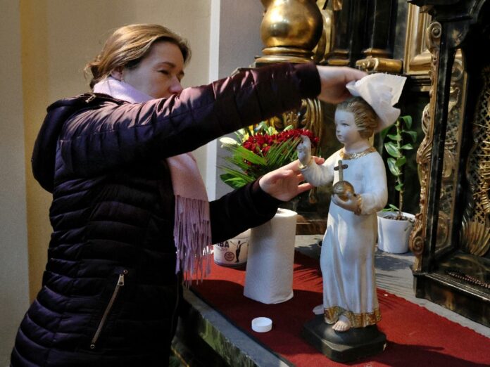 Oblečky odpovídají liturgickému období. Ten nový je fialový v začínající době postní před Velikonocemi. „Máme zatím celkem čtyři – dva bílé, jeden zelený a teď fialový, Chci ušít ještě červený, ale k tomu jsem se zatím nedostala,“ říká při převlékání litoměřického Jezulátka Dominika Valešková.